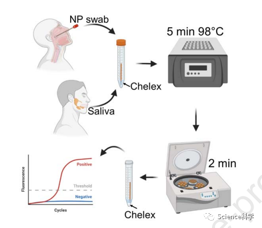 病毒运输介质中的样本由NIH临床中心的COVID-19测试团队进行测试,该团队由Karen M. Frank医学博士领导,使用常规的RNA提取和RT-qPCR测试。螯合树脂缓冲液中的样本被加热,然后通过RT-qPCR测试病毒RNA。与标准方法相比,新的制备方法大大增加了可用于测试的RNA产量。