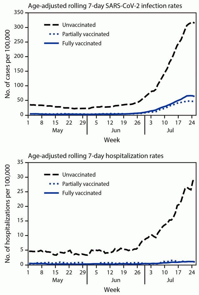 截至7月25日,CDC发现,与接种疫苗的人相比,未接种疫苗的人感染SARS-CoV-2的可能性要高4.9倍,而未接种疫苗的人因感染而最终住院的可能性要高29.2倍。SARS-CoV-2德尔塔变体是上个月这些感染的最常见病例。