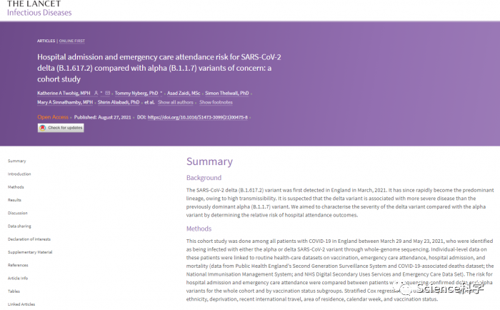这项经同行评议并发表在《柳叶刀·传染病》杂志上的新研究,调查了今年3月至5月间英国约43000个COVID-19确诊病例的数据。研究人员观察了入院情况,将感染Delta变体的患者与感染先前主导的Alpha变体(也称为英国变体)的患者进行了比较。