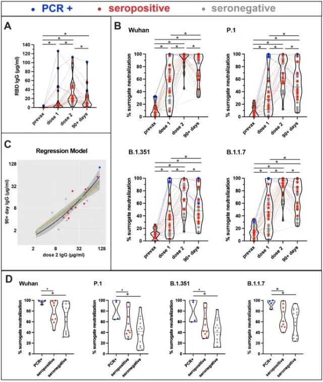 该研究还表明,此前接触SARS-CoV-2并不能保证有高水平的抗体,也不能保证对第一剂疫苗有强大的抗体反应。这直接违背了感染COVID会自然使人对再次感染产生免疫力的假设。这些发现进一步支持接种疫苗(两剂),即使是以前感染过该病毒的人。