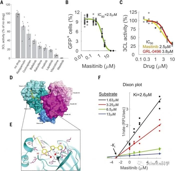 他们还将候选药物送到其他合作者那里,对3CL蛋白酶进行测试,这是冠状病毒内允许它们在细胞内复制的一种酶。他们发现,在候选药物中,马赛替尼完全抑制了细胞内的3CL病毒酶,这一事实被APS结构生物学中心(SBC)的Andrzej Joachimiak及其同事通过X射线晶体学证实。该药物特异性地与3CL蛋白酶活性位点结合,抑制了病毒的进一步复制。