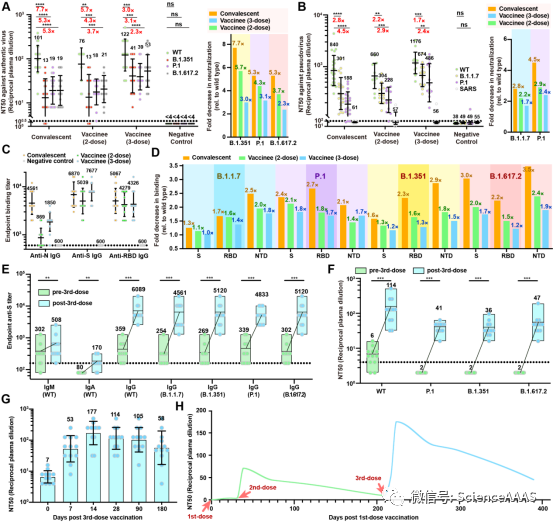 该研究通过对新冠早期康复者、接种2剂和3剂灭活疫苗志愿者血清学分析,发现接种三剂灭活疫苗的血清样本后,表现出更为迅速的免疫应答反应、更加持久的体液免疫反应,以及对德尔塔等多种变异株产生更加广谱的中和能力。