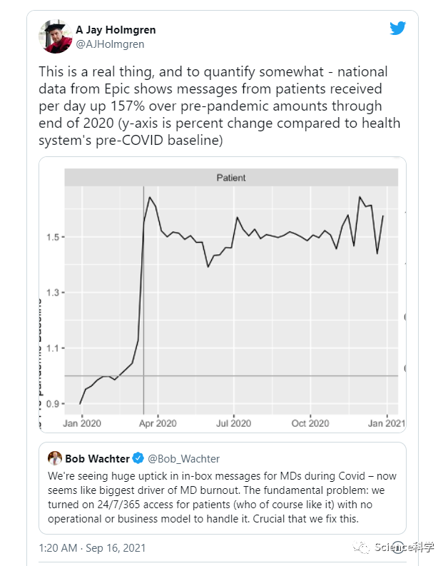 Holmgren在Twitter上发布了这些数据,作为关于收件箱过载和医生倦怠的对话的一部分。加州大学旧金山分校医学系主任Bob Wachter写道:“我们为病人打开了全天候的通道(他们当然喜欢这样),但却没有任何操作或商业模式来处理它。”