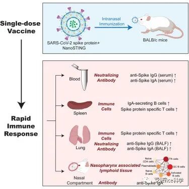 “我们使用NanoSTING作为鼻内接种的佐剂,并通过单细胞RNA测序来确认鼻腔相关淋巴组织是接种后的一个诱导部位。”Varadarajan说:“我们的结果表明,候选疫苗配方是安全的,能在七天内产生快速的免疫反应,并能引起对SARS-CoV-2的全面免疫力。”