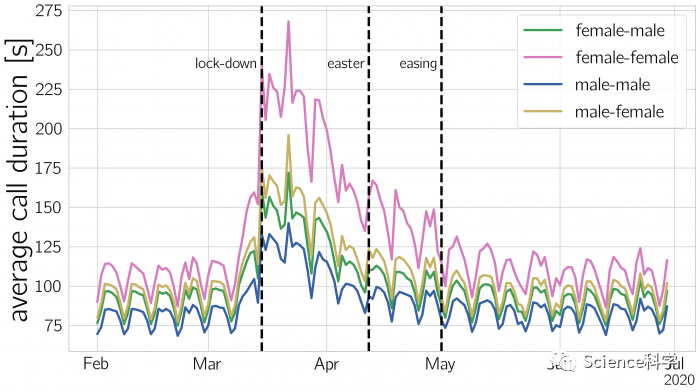 受COVID-19影响,在2020年3月16日奥地利政府宣布第一次社会封锁后,女性与女性之间的通话时间比危机前长达1.5倍(+140%),男性与女性之间的通话时间几乎是两倍(+97%)。相反,当女性给男性打电话时,她们的通话时间延长了80%。男性之间的通话时间只增加了66%。
