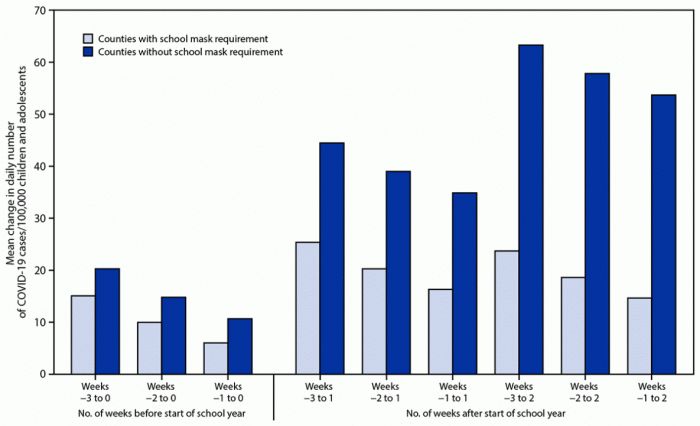 第二项研究从不同的角度来探讨这个问题。它研究了美国各地的儿科COVID-19病例,并检查了有学校口罩要求的县和没有学校口罩要求的县在学年开始后的病例数增长情况。研究人员只包括那些所有学校都有类似口罩要求的县。