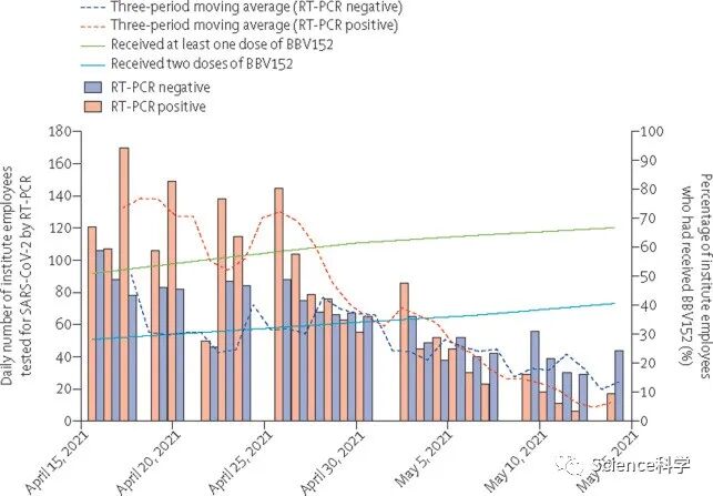 作者指出,有几个因素可能是造成本研究中疫苗有效性较低的原因。首先,该研究人群只包括医院员工,他们可能比普通人群有更高的COVID-19感染风险。其次,这项研究是在印度第二波COVID-19感染高峰期进行的,医院员工和德里居民的检测阳性率都很高。第三,令人担忧的循环变体的流行,特别是delta,可能导致BBV152的有效性降低。