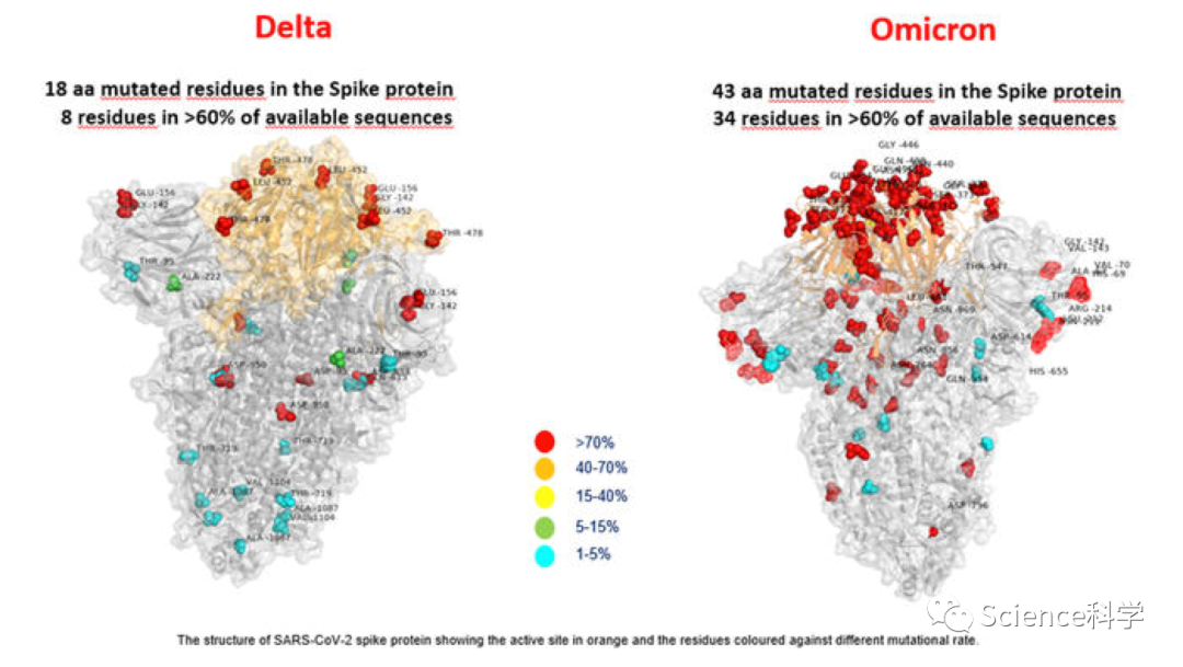 图片显示,与新冠变异病毒德尔塔毒株相比,奥密克戎毒株拥有更多的刺突蛋白突变,这些变异多样化,且大部分位于与人体细胞相互作用的区域。