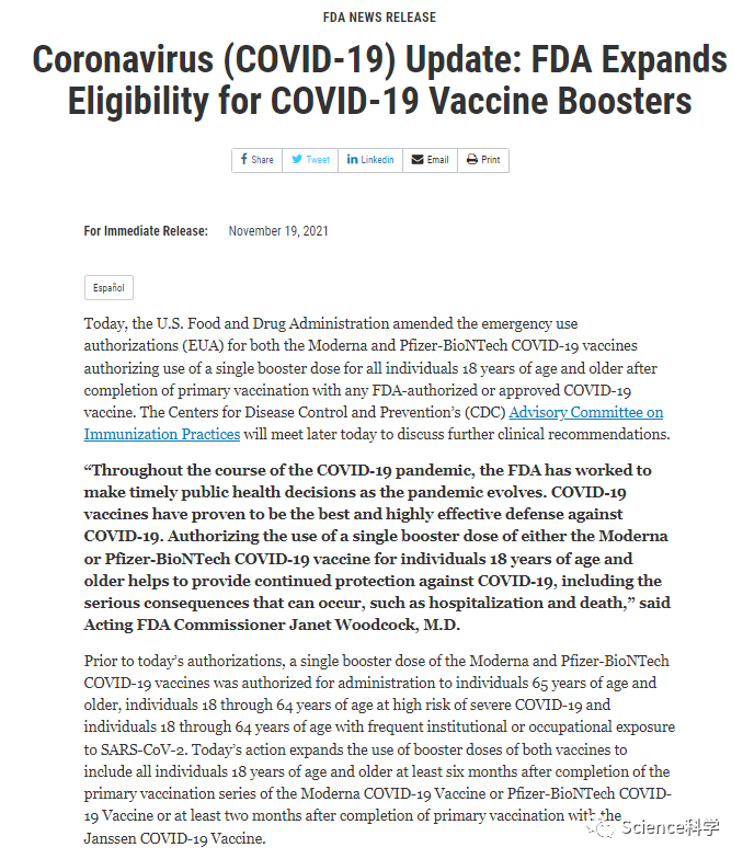 FDA:所有美国成年人现在都有资格接种第三剂COVID-19疫苗