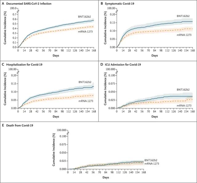 据了解,这项研究评估了Moderna COVID-19 mRNA疫苗5个月的有效性。研究覆盖了352878名接受了2剂Moderna COVID-19疫苗的人及352878名未接种疫苗的人。接种者则是在2020年12月18日到2021年3月31日接受了2剂Moderna COVID-19疫苗。两组的个人都被随访到2021年6月30日。
