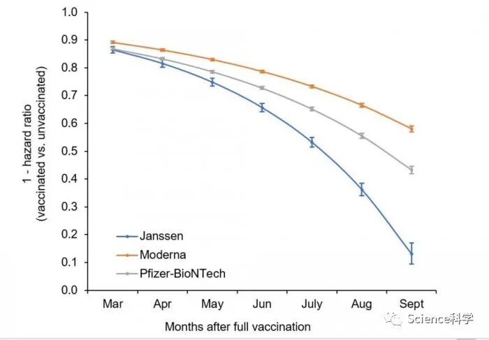 总体而言,在八个月的研究期间,疫苗对COVID-19感染的保护率从87.9%下降到48.1%。强生疫苗的VE-I下降幅度最大,从86.4%下降到13.1%。辉瑞公司的感染保护率从86.9%下降到43.3%,而Moderna在三者中表现最好,从89.2%下降到58%。