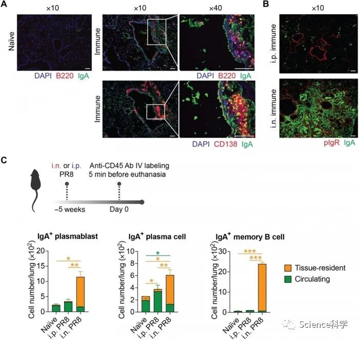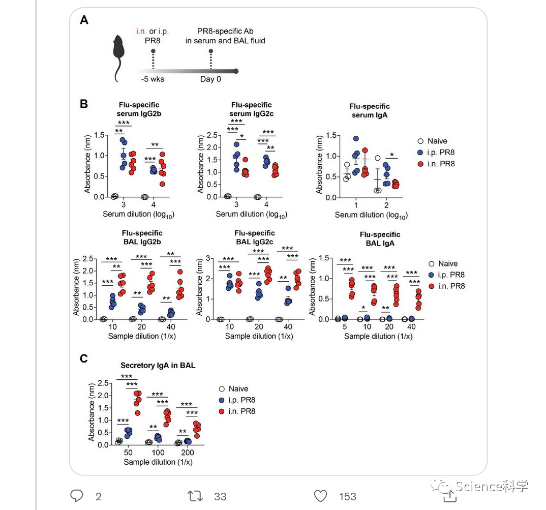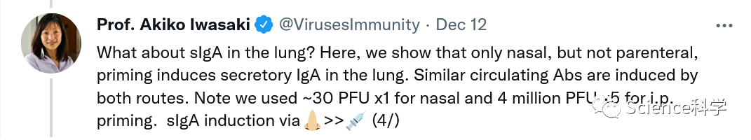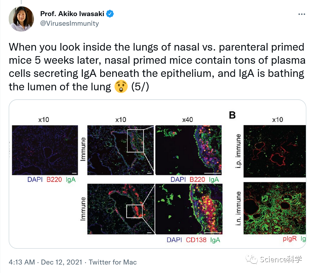 Iwaskai在Twitter上发文称:“当你在5周后观察鼻腔跟肠外引流小鼠的肺部时,鼻腔引流小鼠的上皮下含有大量分泌IgA的浆细胞,而IgA正沐浴在肺部的管腔中。这些分泌IgA的细胞在5周后主要是组织驻留细胞(意味着它们位于肺部,不会四处移动)。”