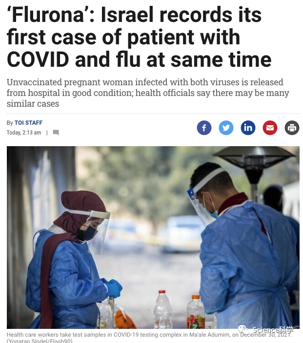 以色列《新消息报》率先报道了这一双重感染病例。该报援引医院妇科主任阿农·维兹尼特塞尔(Arnon Vizhnitser)的话称:“她一到医院就被诊断出同时感染流感病毒和新冠病毒,两项检测结果都呈阳性,甚至在我们再次检测之后也是如此。”