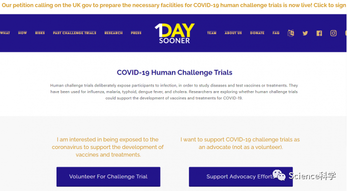 疫苗挑战试验的话题在夏天被提起过不少次,有一个叫 "1 Day Sooner "的网站接受此类项目的报名。但似乎是英国偏爱这样一个有争议的实验。COVID-19不会是第一个用挑战试验来测试疫苗的疾病。但COVID-19没有治愈的方法,也就是说,对于那些故意被感染的患者来说,没有其他选择。如果疫苗不奏效,他们就得像普通患者一样,处理接下来的感染问题。CNN解释说,霍乱、伤寒、疟疾和普通感冒是一些例子,挑战试验曾被使用。