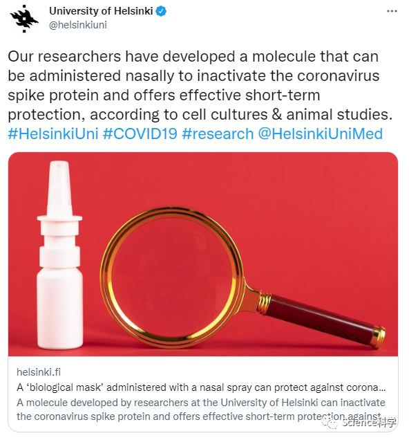 新冠疫情已经持续了两年的时间,与此同时,像疫苗、特效药等预防治疗措施也被研发出来。据外媒报道,来自芬兰赫尔辛基大学的科研团队研发了一种用于预防新冠病毒的鼻腔喷雾疗法,喷一次能够提供8小时的持续保护。