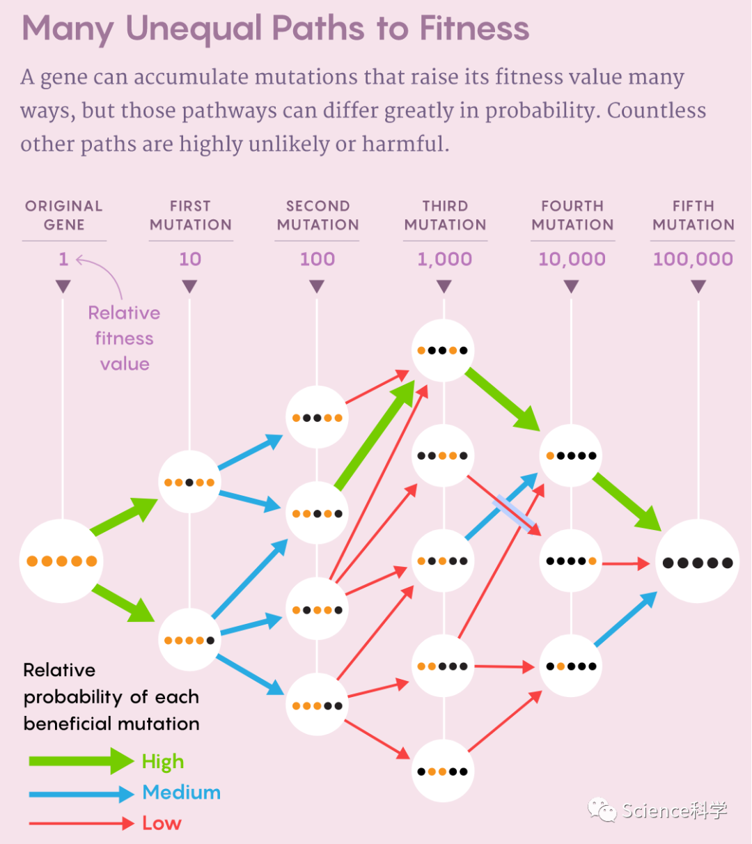 科学家们开始发现的第一件事是,尽管景观很复杂,但生物体往往只受制于少数几个适应度最大值和它们之间有限的路径。2006年《科学》的一篇论文仔细研究了一种叫做β-内酰胺酶的蛋白质,它能使青霉素等抗生素失活。β-内酰胺酶中五个单核苷酸突变的共同作用可以使其抗生素的抗性增加100,000倍。当时在哈佛大学从事进化生物学博士后研究、现在在布朗大学领导一个实验室的Daniel Weinreich和他的同事指出,该基因的进化有可能遵循120条路径来积累所有五个突变。