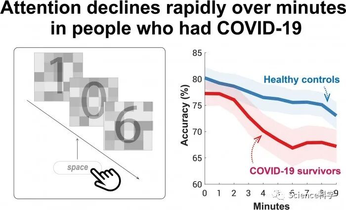 警惕性任务是用来评估一个人在需要持续关注的认知活动中疲劳的速度。与对照组相比,COVID患者在集中注意力约4分钟后,在任务上的准确性显示出快速下降。