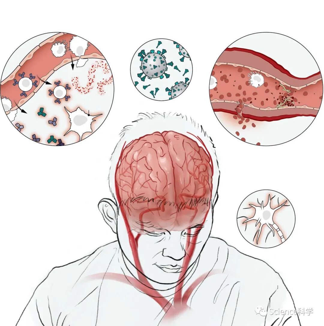 已报道的急性COVID-19的神经系统症状包括味觉和嗅觉丧失、头痛、中风、谵妄和脑部炎症。该病毒似乎没有广泛感染脑细胞,但神经系统的影响可能是由免疫激活、神经炎症和脑血管损伤引起。