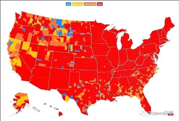 随着奥密克戎变异株在全球继续肆虐,整体疫情形势愈发严峻,全球累计确诊病例已经逼近3.5亿。去年的时候,美国疫情地图就几乎全红了,85.35%的县市成为高传播地区,覆盖美国人口的98%。