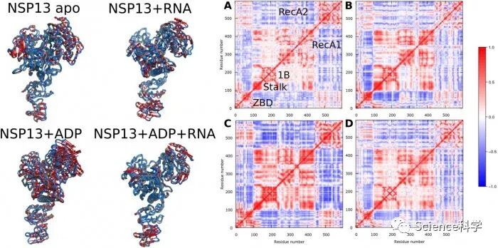 在这个项目中,合作者研究了蛋白质Nsp13,它将双链DNA解开成两条单链--这是复制的一个关键步骤。此前,研究人员知道Nsp13进行这种解旋,但对这一过程的复杂动态没有很好的了解。模拟显示了该蛋白内的多个结构域是如何相互沟通并协同作用以施加正确的力量进行解旋的。