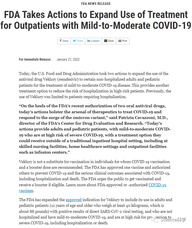 美FDA:瑞德西韦现在可以作为COVID-19门诊治疗药物