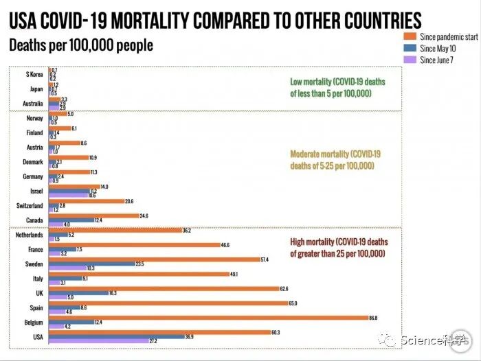 外媒Ars Technica日前制作一张图表将美国新冠肺炎疫情的情况跟其他发达国家进行了对比,结果不难看出美国在应对这一健康危机所表现出来的各种问题。据悉,来自哈佛大学和宾夕法尼亚大学的研究人员比较了18个高收入国家在三个独立时间窗内(分别是2月13日、5月10日和6月7日)的死亡率以此来观察各国死亡率在采取措施减少病毒传播的过程中的变化。