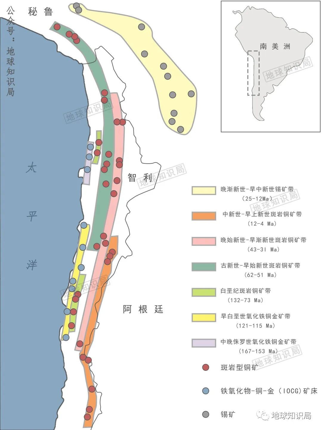 而智利全境都位于环太平洋成矿带上,并且它正位于南美洲与太平洋板块(准确地说,是位于太平洋内的纳兹卡板块)边界上。整个国家都处于两个板块发生汇聚、挤压的地质环境中,这使得斑岩型铜矿遍布其全境,并形成了多个世界级的超大型矿床。