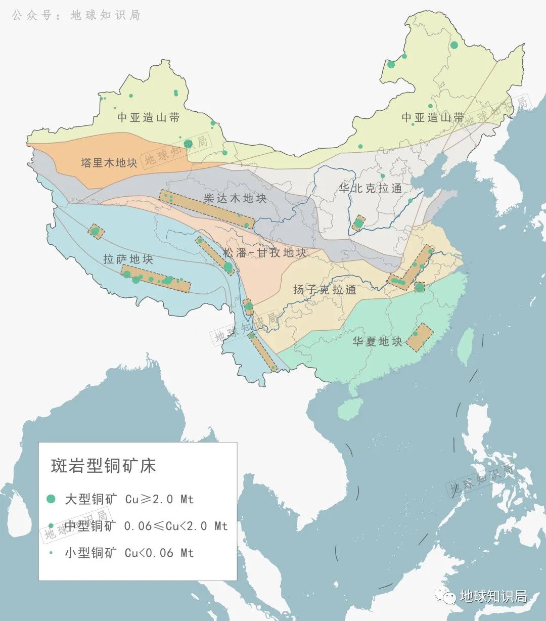 斑岩型矿床贡献了智利所有的超大型矿床,而中国的斑岩矿床规模多不及智利。这与中国的地质环境有关。