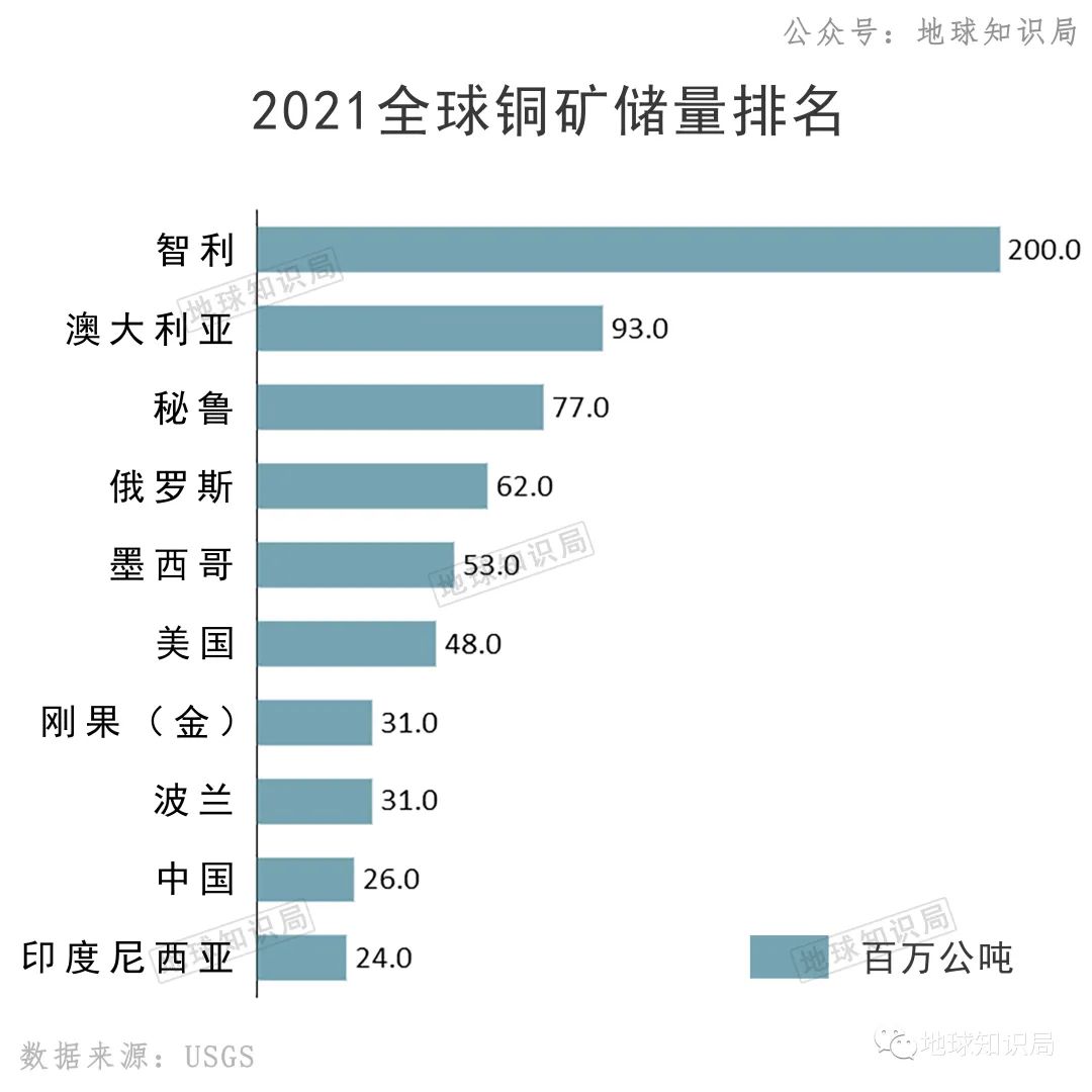 事实上,中国的铜资源储量并不极度匮乏。据美国地质调查局公布的数据,2020年全球铜资源储量8.7亿吨,而我国铜矿储量为3494.79万吨(据2022年中国矿产资源报告),占全球总储量的4%,位列全世界第六位。