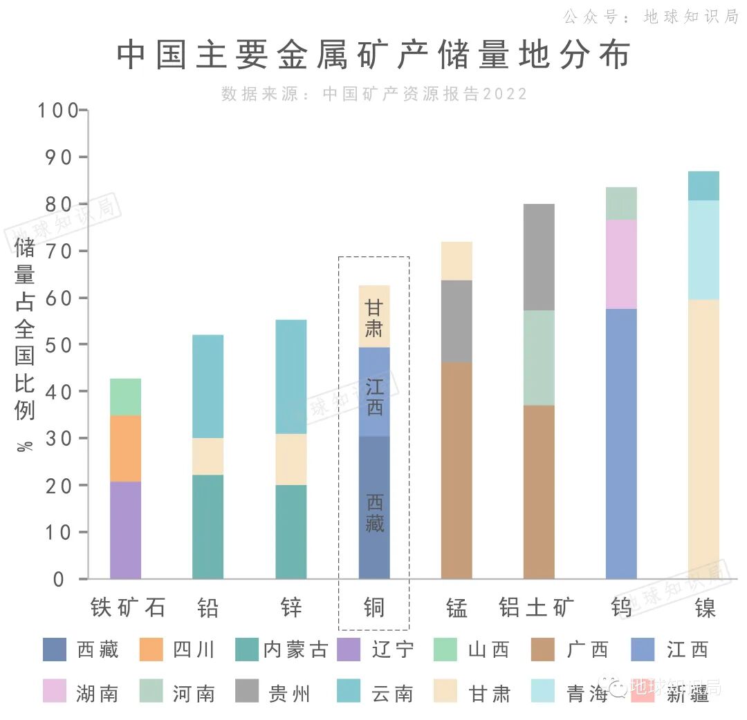 在中国,铜矿资源在空间位置相对集中。主要分布在西藏(占中国铜矿总量22%,同后)、云南(11%)、江西(17%)和内蒙古(16%)等地。