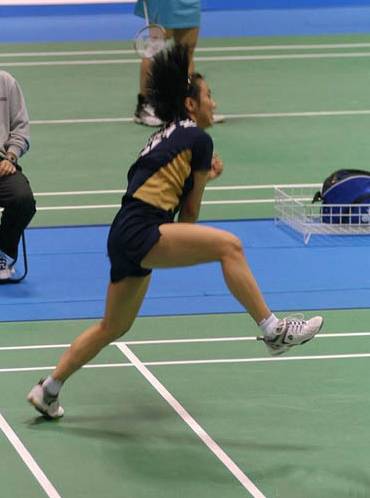 第三步:起跳的时候大概在球开始下落的时候,并且双腿要先保持微屈的姿势准备起跳,靠脚尖蹬地的力量起跳杀球,杀球后立即转身,左脚在后且先着地,右脚落地后即回到场地中心位置。(一般都是单脚起跳,而且根据自己能力尽量跳高一点)