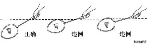 发球时,当球拍击中球的瞬间,发球员球拍的拍杆没有指向下方,使得整个球拍拍头明显地高于发球员的握拍手部(习惯称“发球过手”)。这一规则规定主要是不让发球员用垂直与地面的平拍面发出进攻性的平射球,而要求发球员的球拍面只能以向上的方向击出,使球以向上的弧线越过球网。