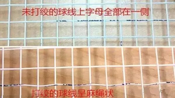 分辨绞线最简单的办法,就是注意看球拍横线上印的型号,如果在一侧就可以看到全部的字母,说明这条横线没有出现绞线,若字母拧成麻花状,则是打绞的表现。