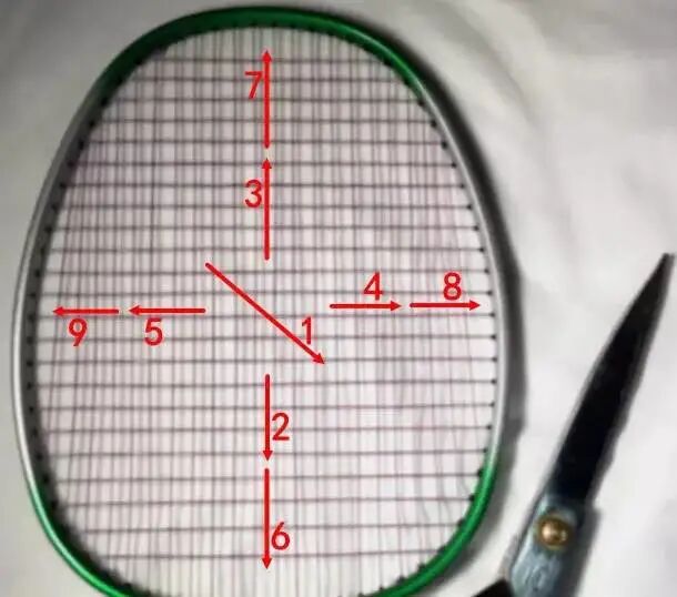 第一步:对于没有断线的球拍,我们首先找到横竖线的中心点,同时交叉剪,即点1位置。