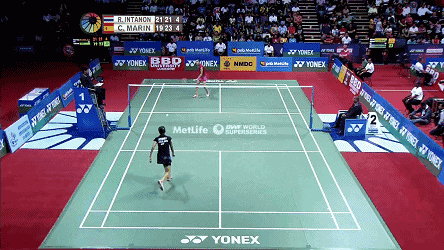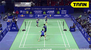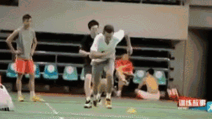 打后场球蹬跳:在场上养成打后场球蹬跳的习惯,交叉换步挑,双脚跳,但不要跳太高、有这个动作就行,主要是提高击球点、利用上蹬跳的力量,增加发力时的力量,并且使发力更顺畅,看看因达农教科书般的实战演练。