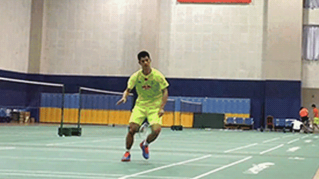 看到对方来球方向后,左脚掌内侧用力蹬地,右脚向来球方向迈出一大步,脚尖向外撇,脚跟先落地,两腿成弓箭步。接着左脚自然跟进半步。击球结束后,右脚蹬地回到出发的位置。