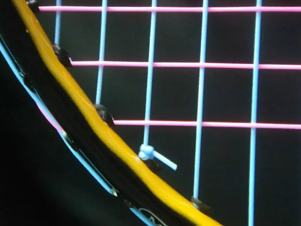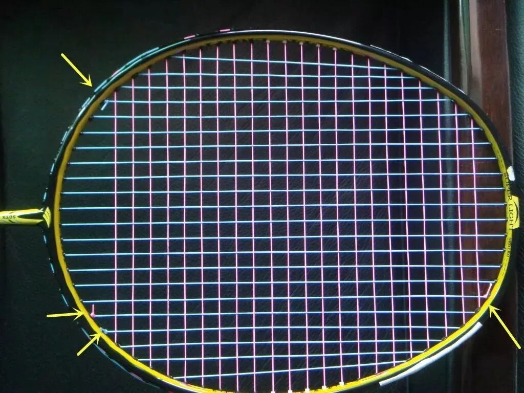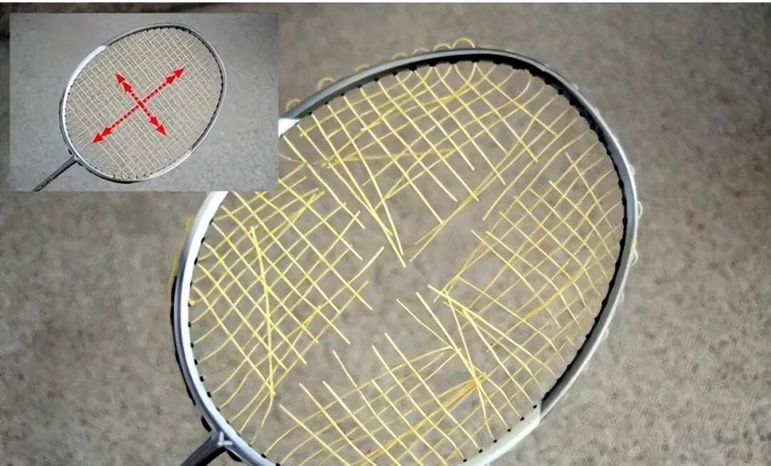 尤尼克斯穿线方式,分为两条线,横竖分开的穿法,有四个线结,四结法统一横线比竖线高10%的磅数,一般都是高2磅,四结法穿线方式可以使线床受力更为均匀,但容易掉磅。