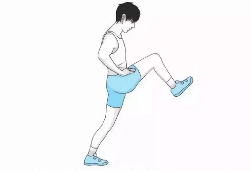 身体采取自然站姿,右腿抬高将前脚掌放在一个固定的位置上,左腿直立,脚尖指向正前方,弯曲右腿的膝盖,向下压,感觉到左腿的拉伸后保持5-15秒再恢复动作,两侧动作交替进行。
