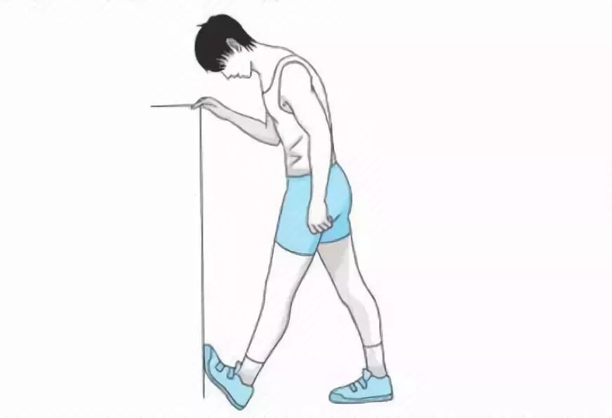左脚向前踏出,靠墙壁左脚踝向上弯曲,脚指头朝上。上身前移,小腿感觉到拉伸后保持5-15秒钟再恢复动作,两腿交替进行。