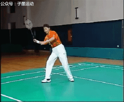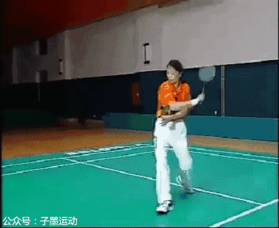 反手底线抽球:脚步动作和反手高球、吊球是一样的。右脚从左脚前交叉,跨步到左侧,背对球网。向身后引拍,然后“横扫”来球。