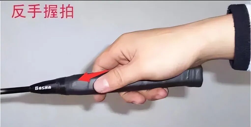 反手握拍:在正手握拍的基础上顺时针稍微转一下,食指在拇指下面或与拇指相等的位置,拇指与宽面平行,拇指顶在宽面上发力,食指辅助。