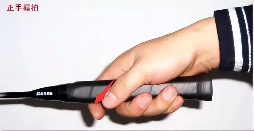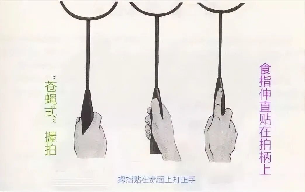 正手握拍:食指在拇指上面的,拇指与宽面是不平行的,此时依靠食指发力,拇指控制和辅助发力。