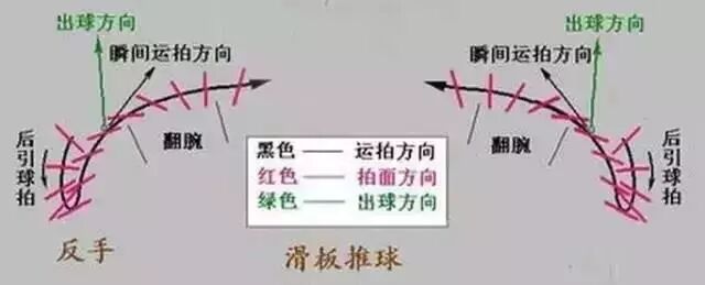 推球时的挥拍路线,正手推球是由于前臂的内旋,带动手腕由后伸闪动到屈腕,也就是说由右至左像盖过去的旋转动作那样,挥拍推击球。