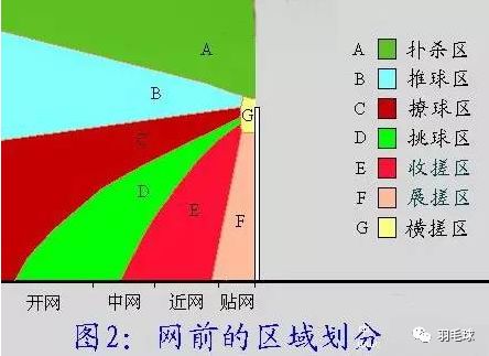 图2是FLAX根据自己的打球体会,对网前位置做的区域划分,图中所表示的是双方前发球线之间的局部范围。
