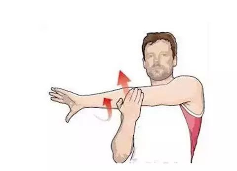 在羽毛球运动中,肩关节付出了大部分力量,所以肩关节是最需要放松的部位。先从右肩关节开始:右手臂向左边水平伸直靠近前胸,并用弯曲的左手肘协助右手臂伸向左边,保持5次呼吸;换左手臂同样重复一次。
