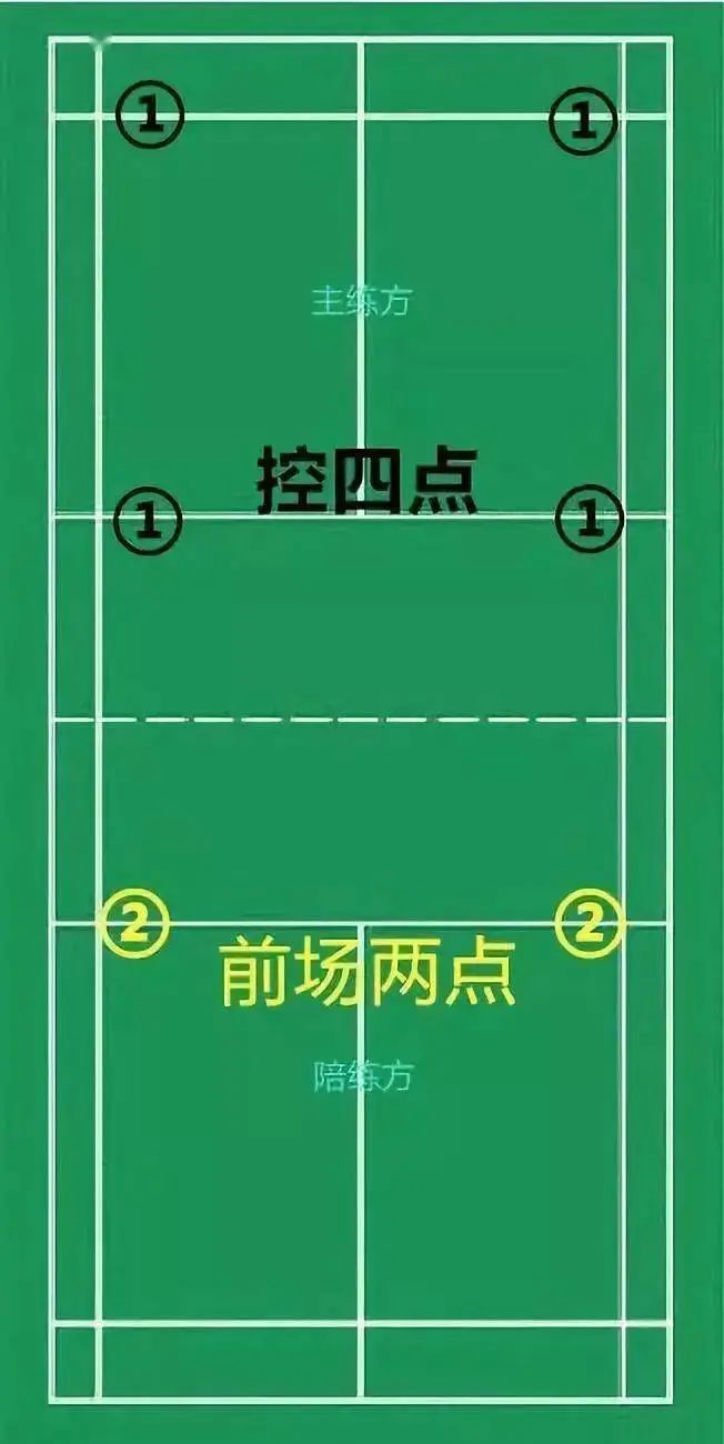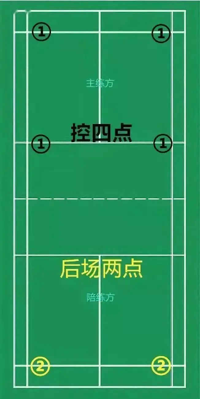 主练方是全场四个位置附近的被动回球,把球回到陪练方两个底线的位置。主练方通过网前的挑球、后场的高远球及平高球把球打到底线两点,练的是后场的到位球