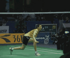 1、准备时左脚向左前移一小步,同时,上体稍侧左转,右脚向球的落点方向跨出一大步,重心在右脚上。球拍由身前引向左下方,拍面朝上。