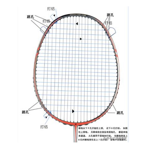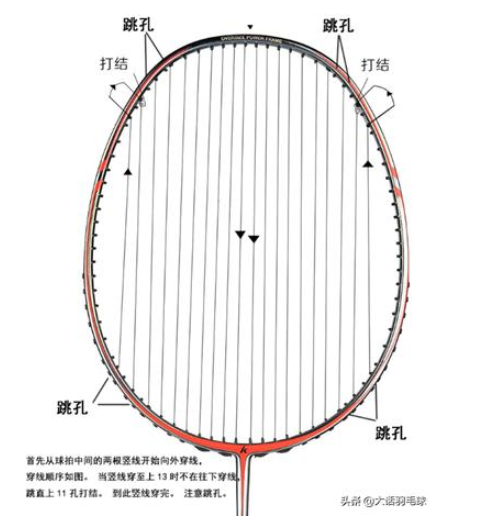 注意,当竖线穿完R9或L9时,在拍喉处直接从第9孔跳到第12孔穿最后一条竖线,这样主要有利于保持最后一条竖线的磅数以及方便打结线打结,维持球拍受理均匀。