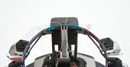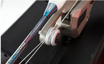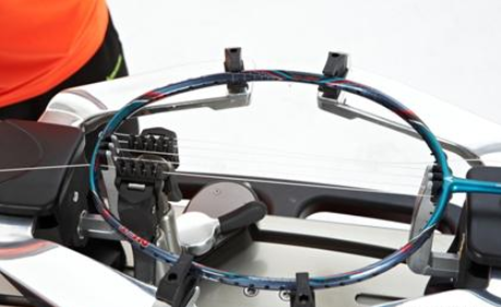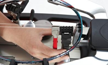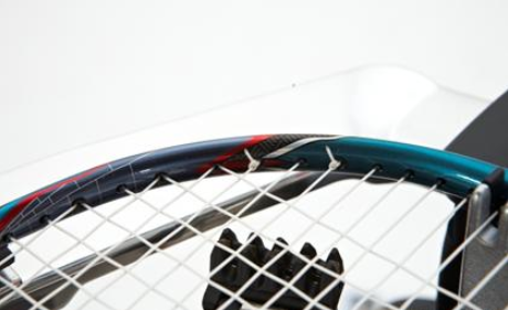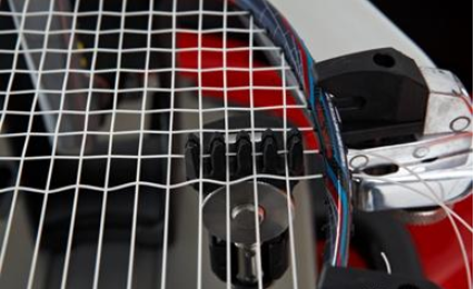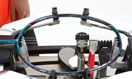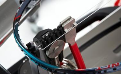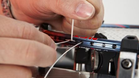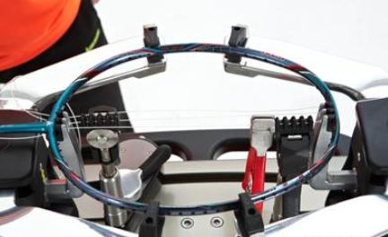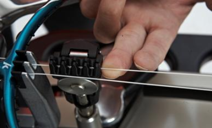 把两条线平行在缓冲器缠绕一圈(注意球线互相不要压着,那样容易伤到线),再放入拉力头同时拉紧。整个穿线过程中,这是唯一一次需要同时拉紧2根球线的步骤。