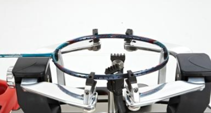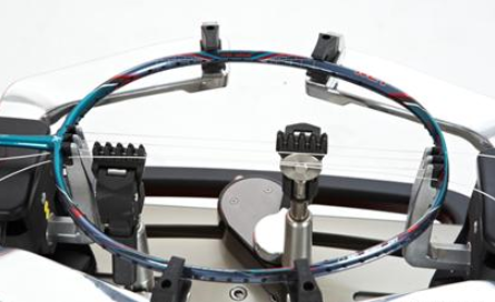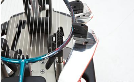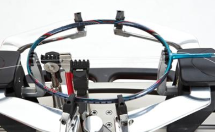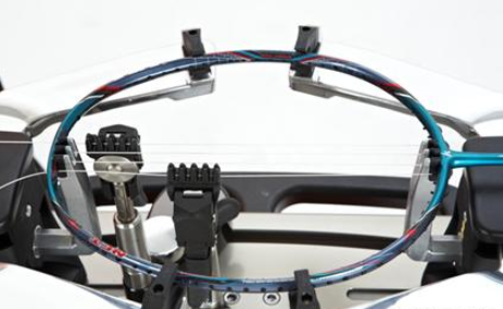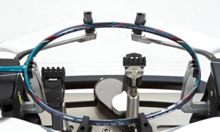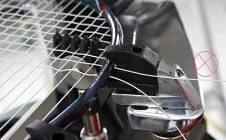 在拉力头拉紧L1的时候,把另一个座夹夹在拍喉的L1处。(注:线夹尽可能夹在靠近拍框部分,大约半公分到一公分距离,并保持左右线夹夹线在同一距离水平,这样有助于球拍受力均匀)然后松开拉力头。注意此处感受线是否在手指上滑动(也可以用肉眼观察),调试线夹的松紧,以及清除线夹内多余的硅胶或其他杂物,确定线夹内部干净,确保线在线夹中不滑动。